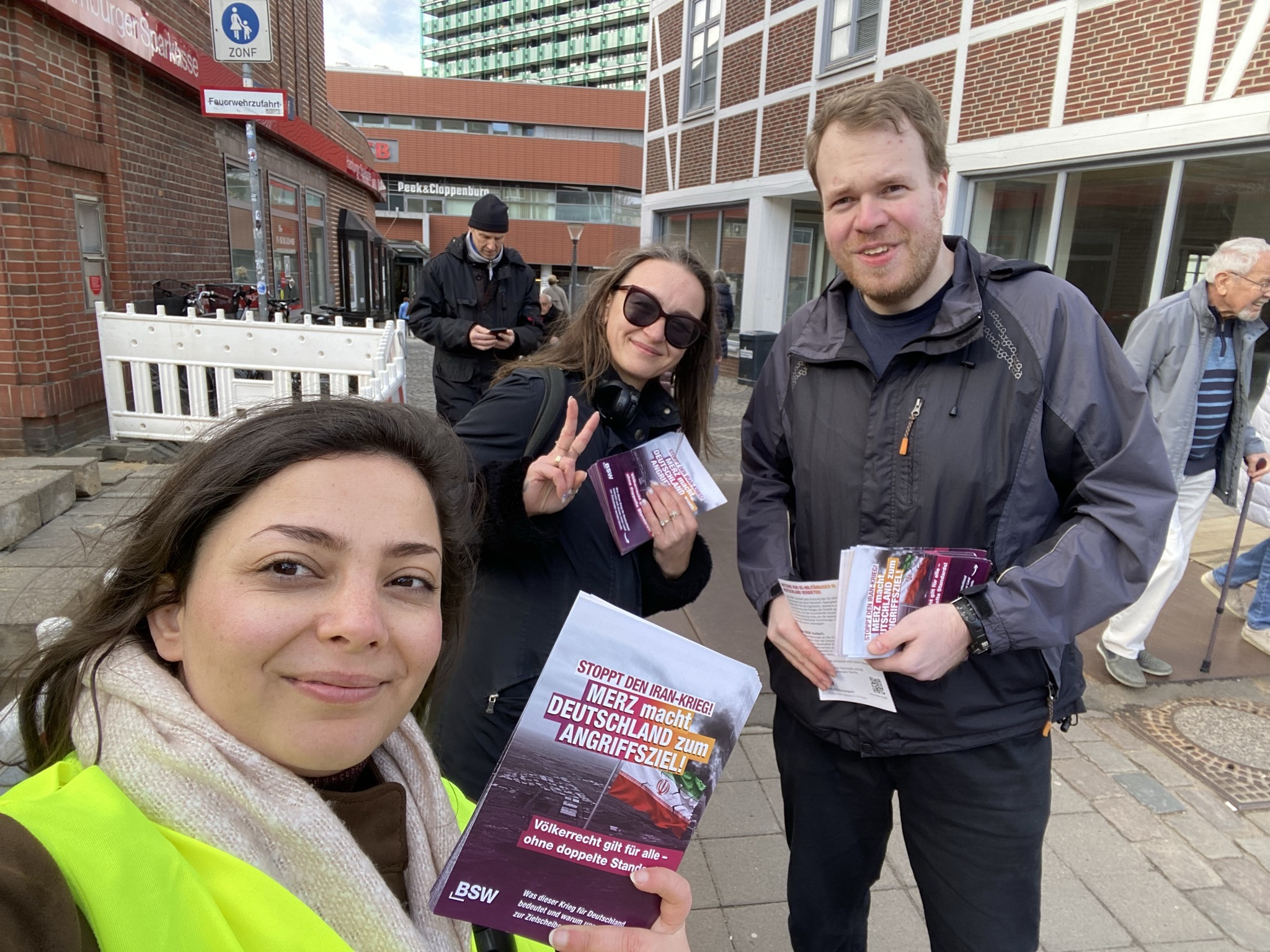 ,Am Ostersonnabend waren die Bezirke Bergedorf und Harburg unterwegs, um zum Ostermarsch aufzurufen. In Harburg kamen wir mit Leuten in der Fußgängerzone Lüneburger Straße ins Gespräch über das BSW und aktuelle politische Entwicklungen. Unterstützt wurde das Team in Harburg aus dem Landkreis Harburg, Niedersachsen. Dort sind im September Kommunalwahlen.
