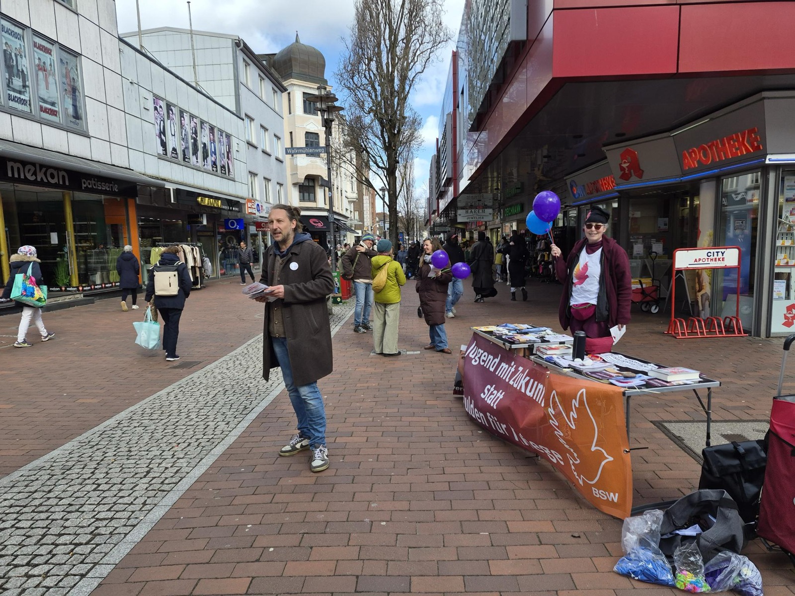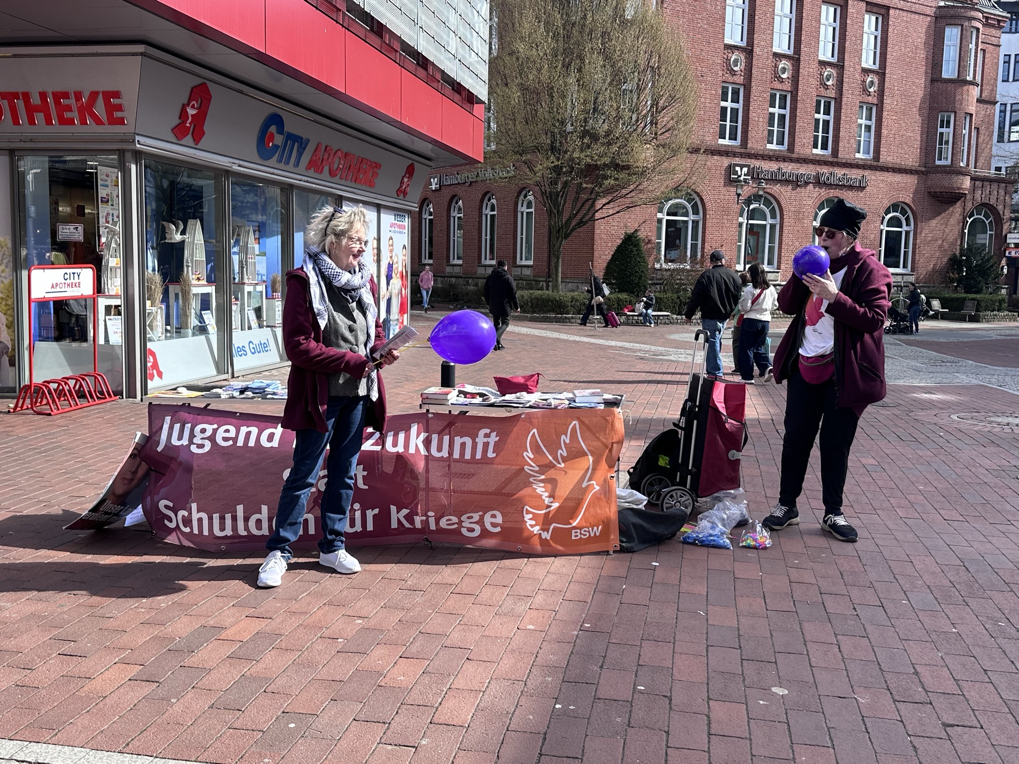 ,Am Ostersonnabend waren die Bezirke Bergedorf und Harburg unterwegs, um zum Ostermarsch aufzurufen. In Harburg kamen wir mit Leuten in der Fußgängerzone Lüneburger Straße ins Gespräch über das BSW und aktuelle politische Entwicklungen. Unterstützt wurde das Team in Harburg aus dem Landkreis Harburg, Niedersachsen. Dort sind im September Kommunalwahlen.